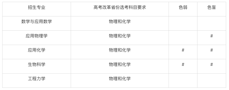我校招生專業(yè)包括數(shù)學(xué)與應(yīng)用數(shù)學(xué)、應(yīng)用物理學(xué)、應(yīng)用化學(xué)、生物科學(xué)和工程力學(xué)。所有招生專業(yè)在非高考改革省份招收理科考生,在高考改革省份選考科目要求見(jiàn)下表: