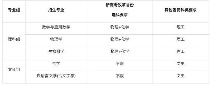 服務(wù)國家重大戰(zhàn)略需求的基礎(chǔ)理科學(xué)科以及國家人才緊缺的社會科學(xué)與人文學(xué)科領(lǐng)域,招生專業(yè)、選考科目、科類要求及招生計劃見下表: