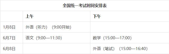 全國統(tǒng)考科目使用全國統(tǒng)一命題試卷,考試時間安排在6月7日全天和8日下午,其中語文考試時間150分鐘,數(shù)學(xué)考試時間120分鐘,外語(筆試)考試時間100分鐘。外語(聽力)考試安排在1月8日上午,連續(xù)組織兩次,每次考試時長約20分鐘,考試成績?nèi)纱沃械母叻钟嬋敫呖纪庹Z科目成績。
