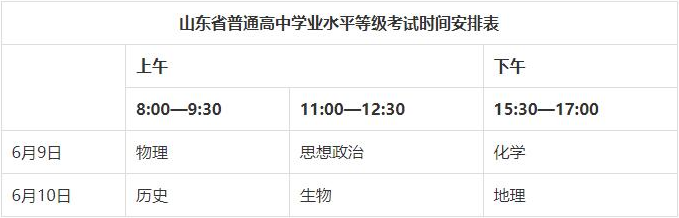 普通高中學(xué)業(yè)水平等級考試由山東省自主命題,考生從思想政治、歷史、地理、物理、化學(xué)、生物等6個科目中選報3科參加考試??荚嚂r間安排在6月9日至10日,每科考試時間90分鐘。