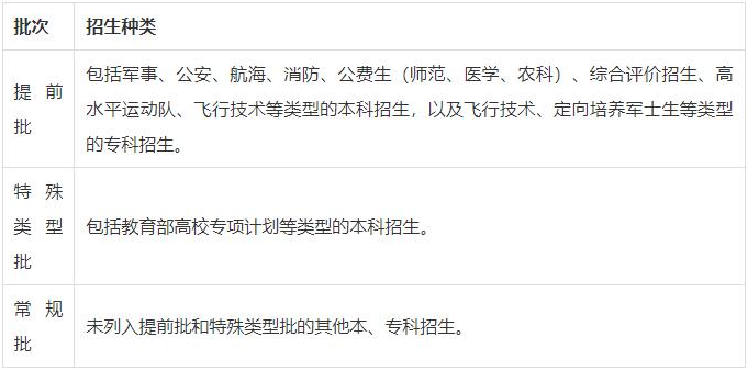 答:普通類分為提前批、特殊類型批和常規(guī)批三個錄取批次,錄取工作按三個批次依次進行。各批次包含的類型為: