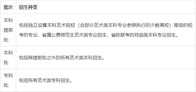 答:藝術(shù)類分為本科提前批、本科批和專科批三個錄取批次,錄取工作按三個批次依次進行。各批次包含的類型為: