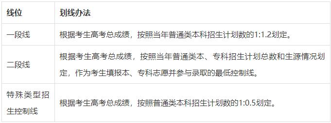 答:普通類劃定一段線、二段線、特殊類型招生控制線3條分數(shù)線。具體劃線辦法為: