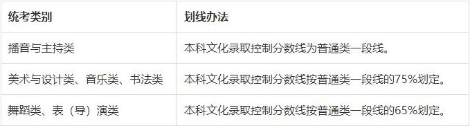①藝術(shù)類本科文化錄取控制分數(shù)線。少數(shù)經(jīng)教育部批準組織??嫉膶I(yè)文化錄取控制分數(shù)線為普通類一段線,破格錄取考生文化成績要求按照招生高校破格錄取辦法執(zhí)行。實行省際聯(lián)考的戲曲類專業(yè)本科文化錄取控制分數(shù)線為普通類一段線的65%。其他藝術(shù)類本科高校及專業(yè),分藝術(shù)類別劃定文化錄取控制分數(shù)線,各藝術(shù)類別劃線辦法如下。②藝術(shù)類高職(專科)文化錄取控制分數(shù)線。與普通類二段線相同。