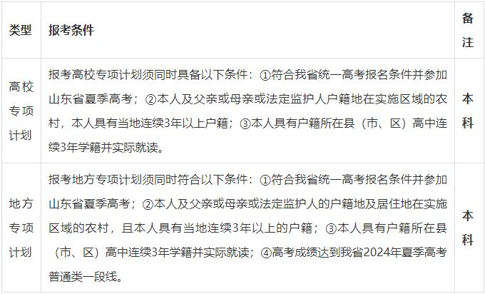 答:地方專項計劃招生是山東省面向農(nóng)村和脫貧地區(qū)實施的招生類型,均為本科層次,招生高校主要為山東省省屬重點高校。高考成績公布后,考生須于6月30日前到所在縣(市、區(qū))教育(教體)局資格審核承辦部門進行資格審核,具體報名條件要求,請登錄山東省教育廳官網(wǎng)查看《關(guān)于做好2024年面向農(nóng)村和脫貧地區(qū)學(xué)生招生專項計劃工作的通知》。獲得山東省地方專項資格的考生需在普通類常規(guī)批填報地方專項計劃志愿,地方專項計劃志愿包含在96個志愿之內(nèi)。
