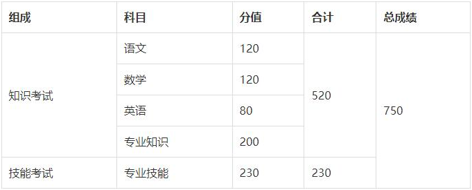 答:春季高考統(tǒng)一考試包括“知識”和“技能”兩部分,考試科目和分值如下表: